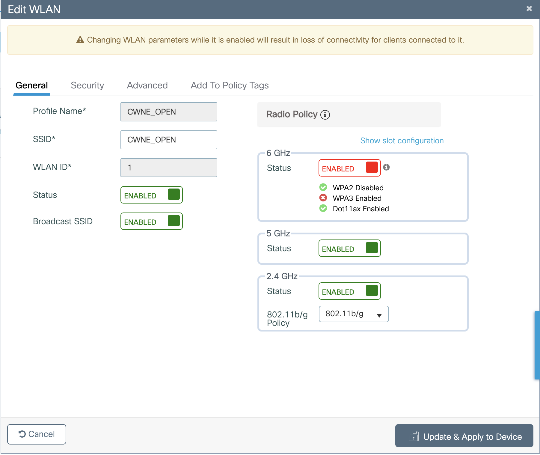 Aquí seleccionaremos nuestro «SSID Profile» y el Policy correspondiente.