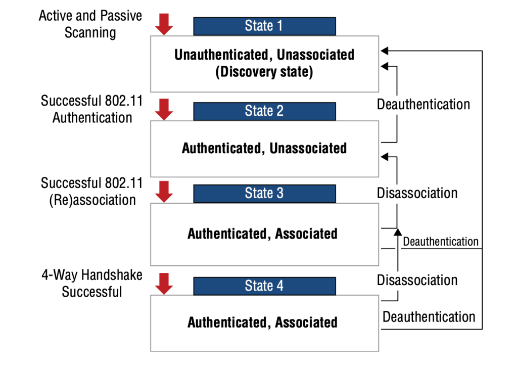 El propósito del state machine es permitir que los clientes y el Access Point se descubran mutuamente y establezcan una relación segura, con el objetivo final de que el cliente se una al BSS. Si no se utiliza seguridad, solo se necesitan tres estados. En la mayoría de los casos, se requiere autenticación PSK o 802.1X/EAP, y en ese caso, se producirán los cuatro estados.