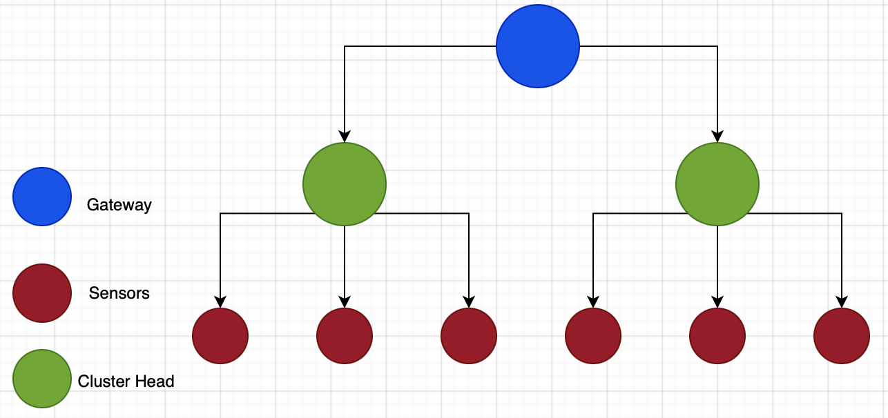A complex hierarchical architecture may use cluster with all sensor un a cluster connecting to a cluster head, which is connected to the Gateway. Other terms for gateways include base station, coordinator, hub and controller.
