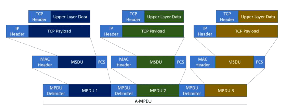 Un A-MSDU combina múltiples MSDUs en un solo MPDU. Por ejemplo, varios datagramas UDP encapsulados en paquetes IP pueden ser ensamblados en un A-MSDU. El A-MSDU termina conteniendo múltiples paquetes IP, y todos son transmitidos a la capa PHY como un único MPDU basado en A-MSDU.