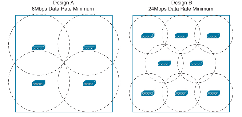 La Figura ilustra el modelo de implementación de datos en dos escenarios. En el Diseño A, una tasa de datos baja de 6 Mbps es aceptable, mientras que en el Diseño B se eleva la tasa a un mínimo de 24 Mbps. Observa que los tamaños de celda de los AP son considerablemente más grandes en el Diseño A que en el Diseño B.