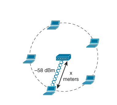 Un dispositivo se localiza midiendo su RSSI desde varios AP que pueden recibir su señal, luego utilizando la técnica de multilateración para calcular su ubicación física en relación con los AP receptores. Con dispositivos 802.11, los AP pueden recibir fácilmente tramas transmitidas por un dispositivo y transmitir la información de la señal a una aplicación que realiza los cálculos de ubicación. Si se utiliza un único AP para determinar la ubicación de un dispositivo, como se muestra en la parte izquierda de la figura la distancia desde el AP hasta el dispositivo puede estimarse por el RSSI y la atenuación de la pérdida de trayectoria de espacio libre. Sin embargo, el dispositivo podría estar ubicado en cualquier lugar a lo largo de un círculo que rodea a e AP.