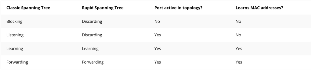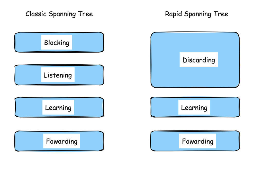 Para poder tener un mejor entendimiento de las diferencias entre Spanning Tree Clasico y Rapid Spanning Tree puedes consultar el siguiente documento