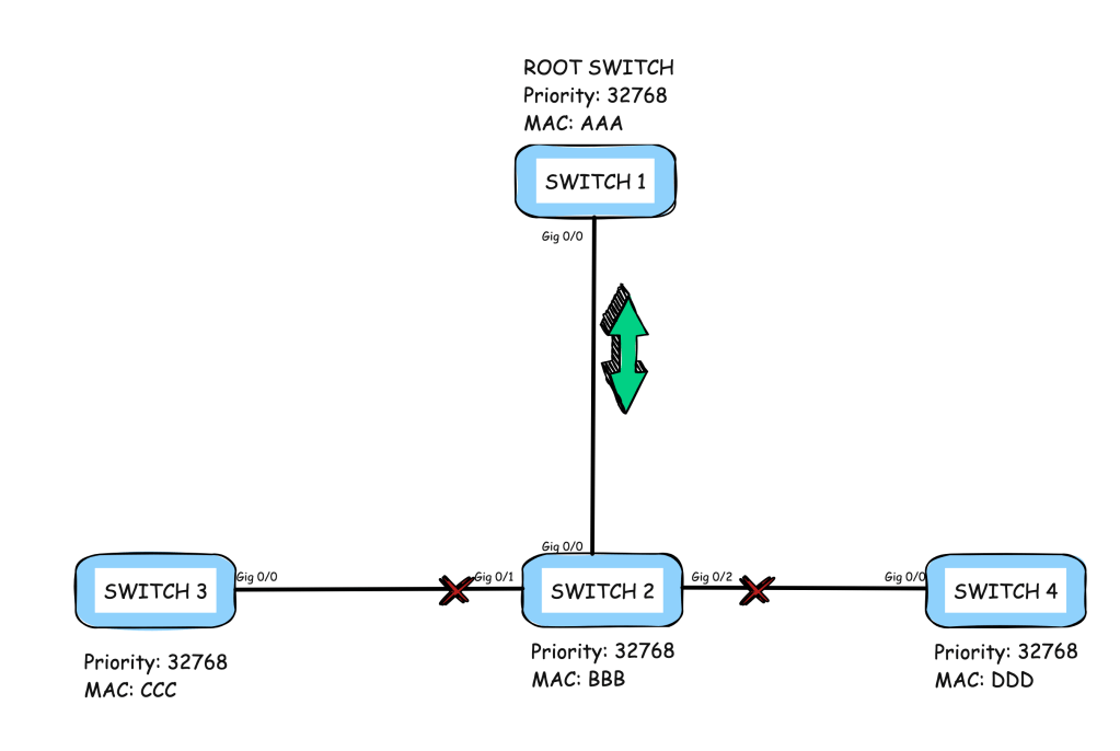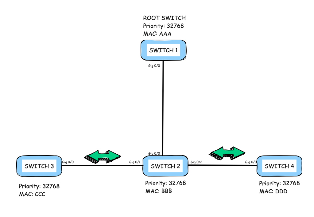 Déjame describir el mecanismo de sincronización de rapid spanning tree usando la imagen de arriba. SW1 en la parte superior es el root bridge. SW2, SW3 y SW4 son non-root bridges.