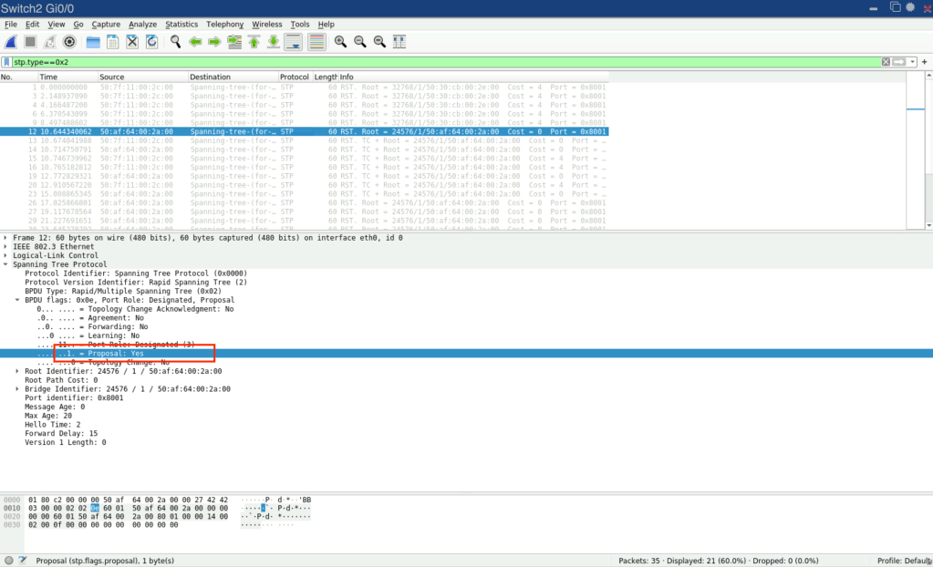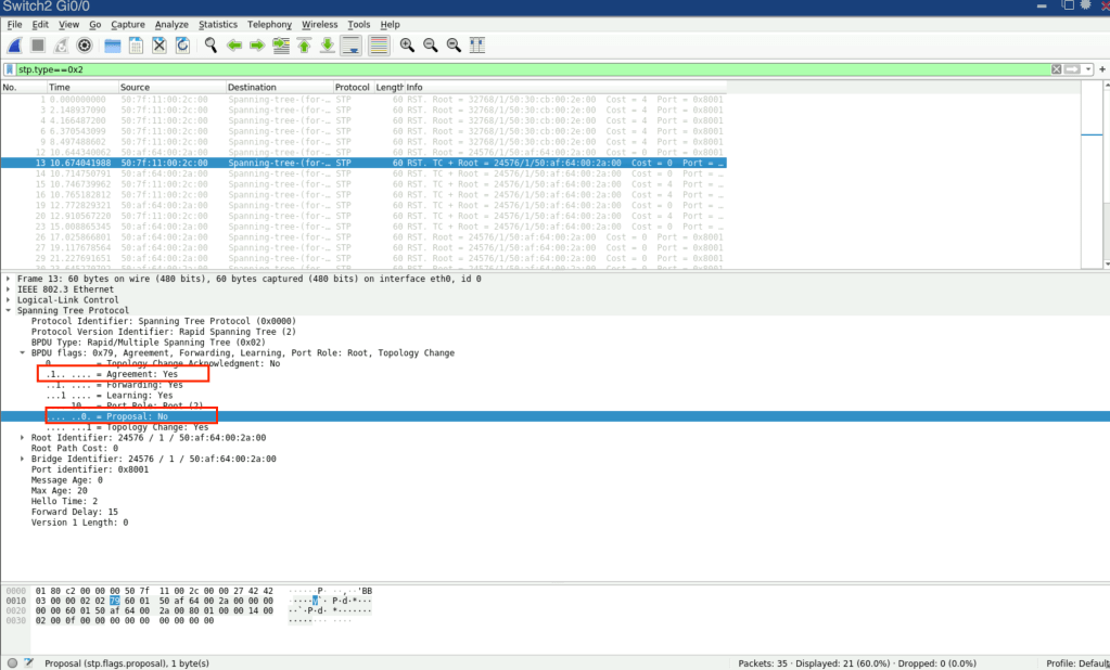 Una vez que SW2 tenga sus interfaces en modo de sincronización, le informará a SW1 sobre esto enviando un agreement. Este agreement es una copia del proposal BPDU donde el bit de propuesta se ha apagado y el bit de acuerdo se ha encendido.