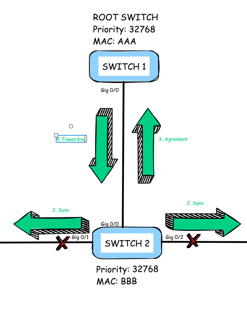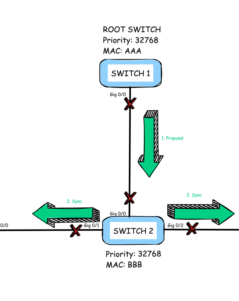 Al principio, las interfaces estarán bloqueadas hasta que se reciban un BPDU de cada uno. En este momento, SW2 descubrirá que SW1 es el root bridge porque tiene la mejor información de BPDU. El mecanismo de sincronización comenzará porque SW1 establecerá el bit de propuesta en el campo de flag del BPDU.
