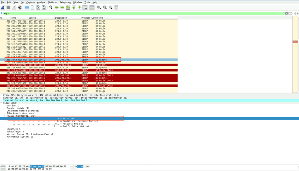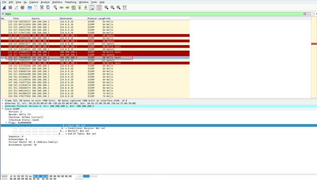 - La primera imagen muestra el intercambio de paquetes hello por medio de la dirección Multicast 224.0.0.10.