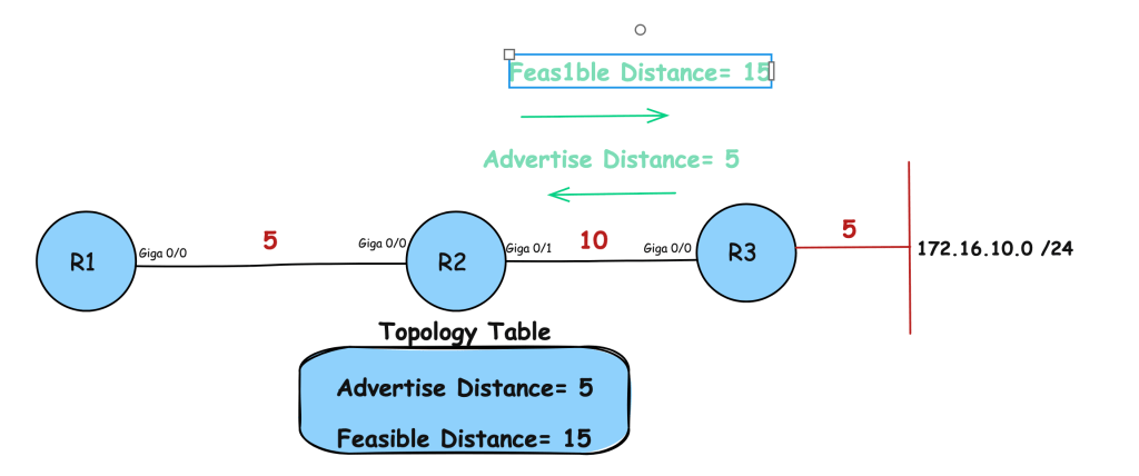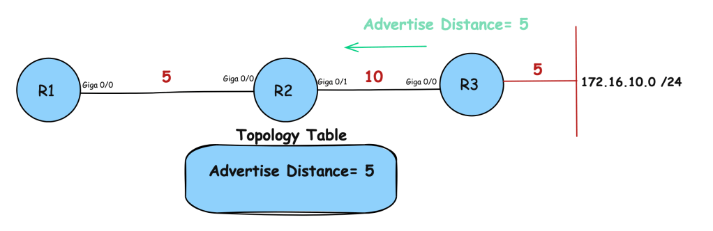Básicamente, R3 le está diciendo a R2: «Me cuesta 5 llegar allí» (advertised distance). R2 tiene una tabla de topología, y en esta tabla de topología guardará esta métrica; la distancia anunciada para alcanzar este destino es 5.